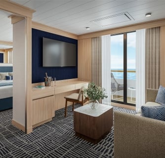The suites have been designed with those details that make a real difference: queen-size beds with genuinely luxurious linens, L’Occitane bath amenities that make every morning feel like a spa day, waffle weave robes that are so comfortable you’ll want to wear them to dinner, and mirrored closets with ample storage for longer voyages. The interactive TVs offer entertainment for quiet evenings when you want to tune out the world, while the vanity areas with magnifying mirrors and comfortable chairs make getting ready feel civilized even when you’re anchored in the middle of nowhere. Thoughtful layouts maximize every inch of space while maintaining that feeling of luxurious comfort. Fresh fruit greets you upon arrival, setting the tone for the level of attention you’ll experience throughout your voyage. And there’s actual drawer space—a small but crucial detail that makes longer voyages feel like extended stays rather than camping expeditions.