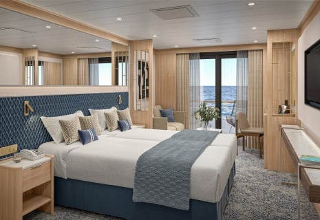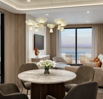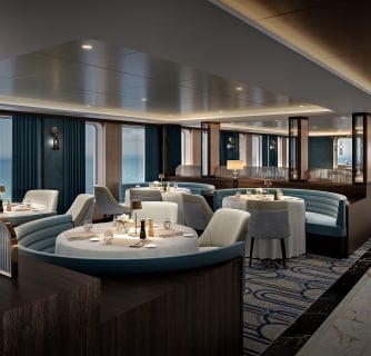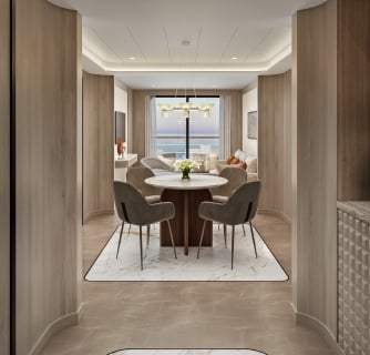 Most of the 112 suites feature either infinity windows or full private verandas, while the two Owner’s suites take this concept even further with wrap-around balconies. Think of these exterior spaces as essentially private outdoor living rooms, suspended above the waves. Imagine hosting an intimate dinner party under the stars, or simply enjoying your morning yoga practice with nothing but ocean stretching to the horizon. Pure bliss.