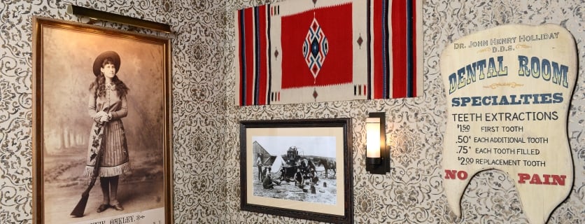 Here, the Wild West comes to life with a magnificent collection of western artifacts featuring historic maps, wanted posters, Navajo rugs, and Winchester rifles like those used by Annie Oakley in Buffalo Bill’s Wild West shows. Archival photos of leathery cowboys adorn the walls, next to buffalo chaps and leather riding gloves embroidered with red roses.